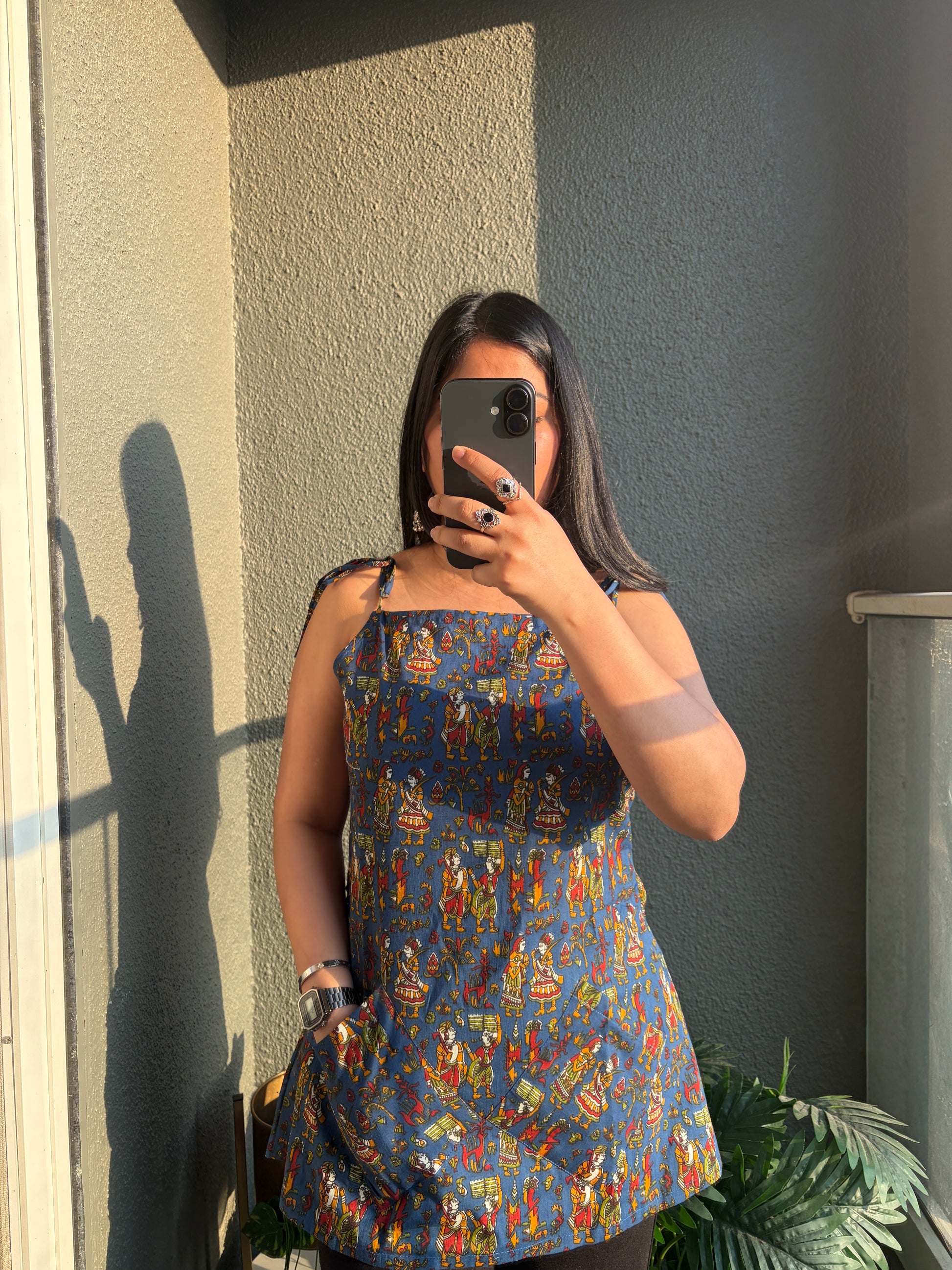 Introducing our Blue Folk Motif Short Kurti, a perfect blend of heritage artistry and modern silhouette. Featuring delicate spaghetti straps and functional pockets, this vibrant piece offers a relaxed fit that transitions seamlessly from a busy day out to a relaxed evening with friends.