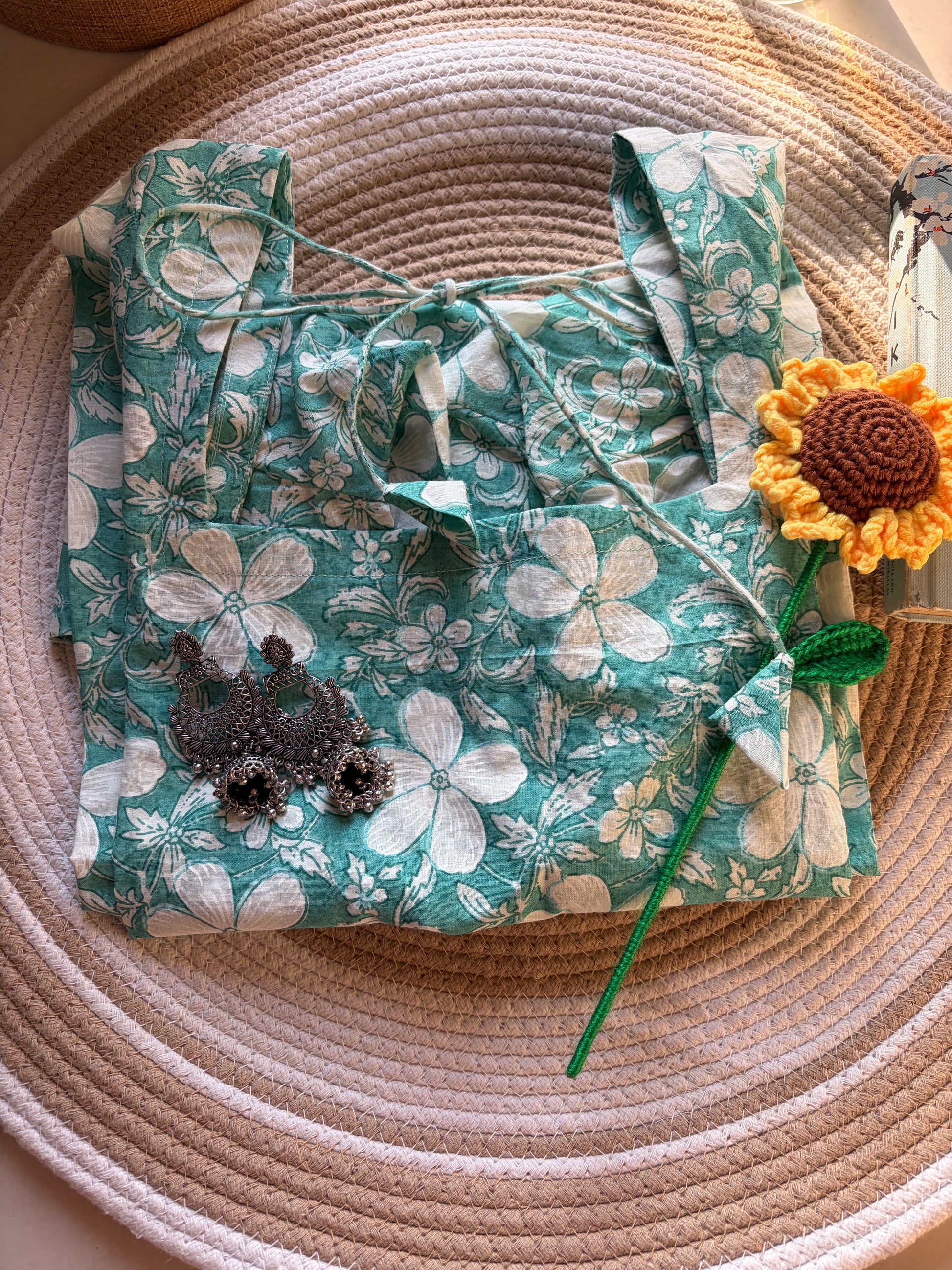 Sophisticated & Airy Meet Meera, a refreshing full-sleeved kurti featuring a serene teal floral print and a chic square neckline. The elegant tie-back detail adds a playful yet sophisticated touch, making it perfect for transitioning from a day at the office to an evening out.