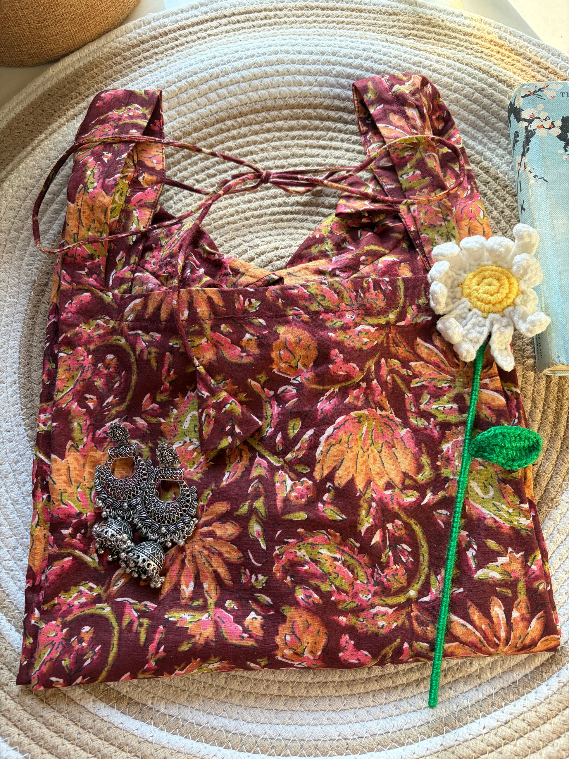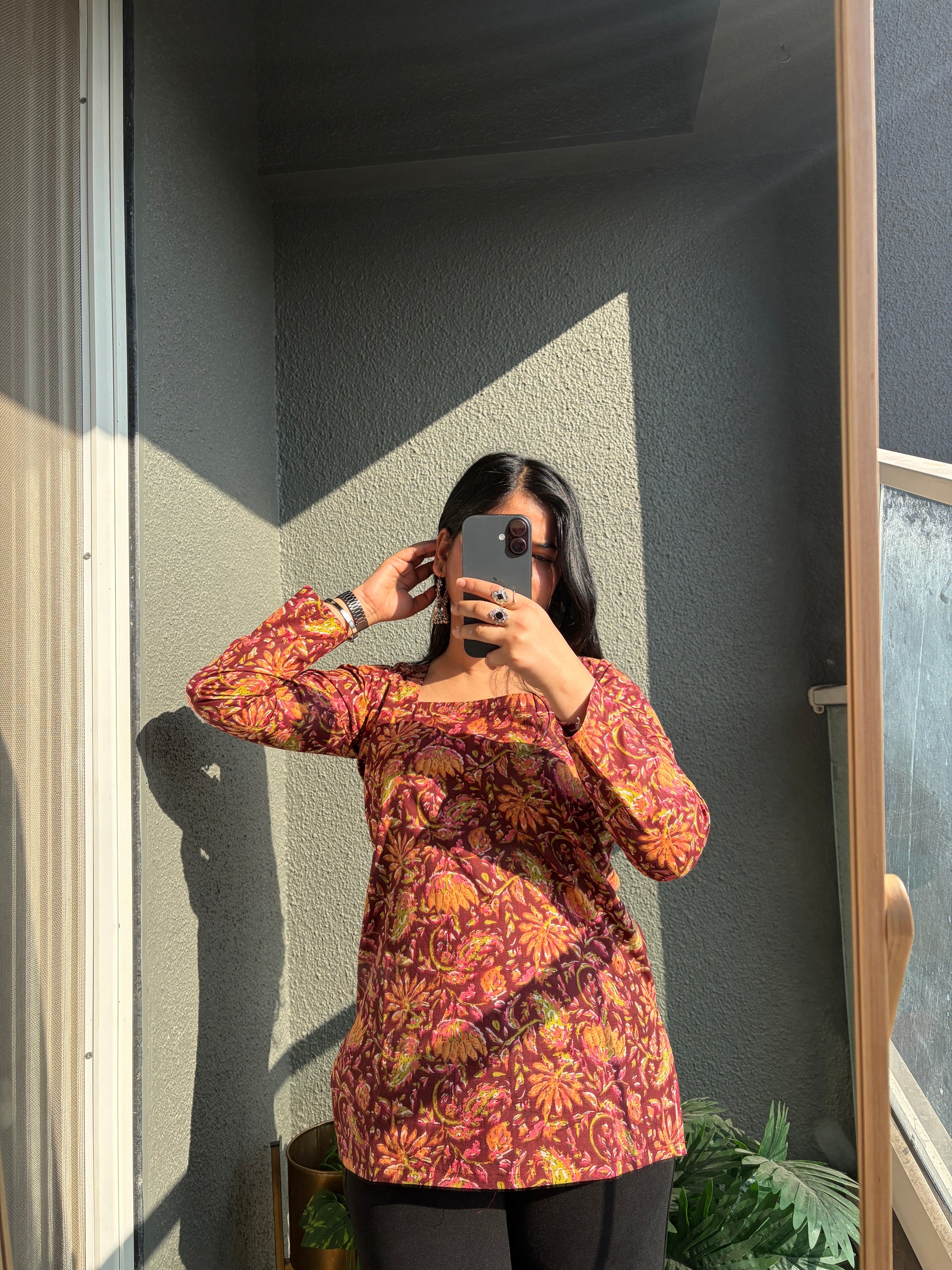 Meet Meera, a captivating full-sleeved kurti featuring a rich maroon floral print and a chic square neckline. The elegant tie-back detail adds a playful yet sophisticated touch, making it perfect for transitioning from a day at the office to an evening out.